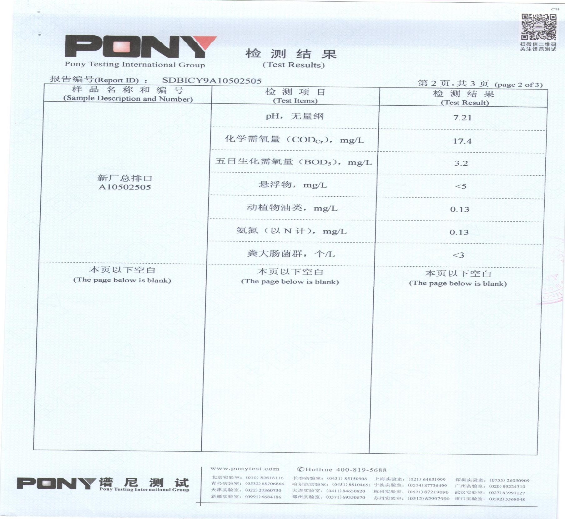 COD:17.4mg/L; 氨氮:0.13mg/L; PH: 7.21mg/L; 五日生化需氧量:17.4mg/L ; 動植物油類:0.13mg/L |